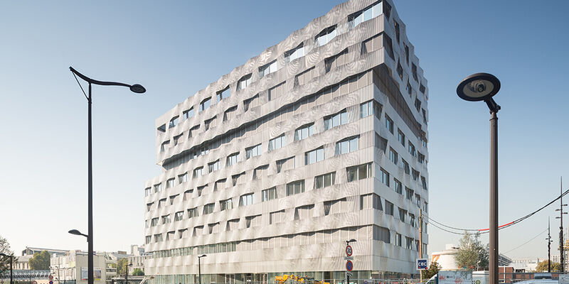 866 stores ZIP verticaux à enroulement Solozip® (1,80 x 1,35 m) en tissu Satiné 5500 coloris 0101 Gris, très résistants au vent, ont été ainsi installés sur les 4 façades. En évitant à la chaleur de pénétrer l’été dans le bâtiment, le tissu protège les espaces de travail et offre une protection solaire optimale.