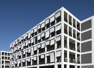 Stores à enroulement extérieurs avec le tissu Satiné 5500 coloris 0606 Bronze pour des logements collectifs.